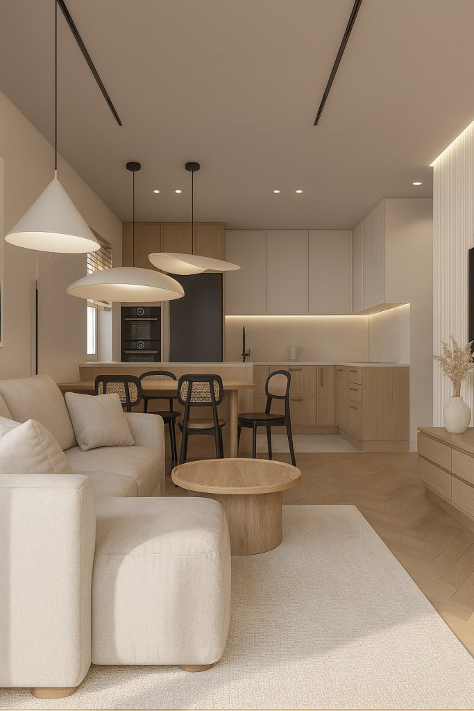 This Scandinavian-inspired living and dining space is a haven of calm and understated elegance. Soft beige tones, light wood finishes, and subtle black accents create a balanced environment that feels both warm and contemporary.