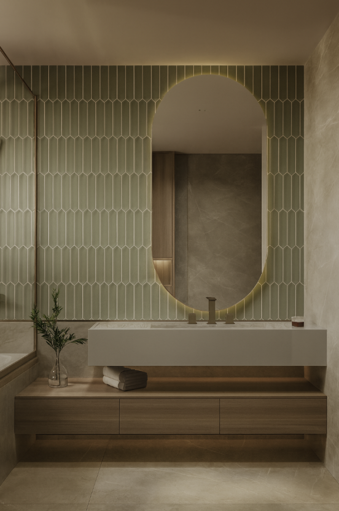 This bathroom embraces soft green and warm minimalism. Here, muted sage tiles are paired with a backlit oval mirror that radiates a gentle glow, instantly setting a calming mood. The floating vanity with its warm wood drawers balances modern simplicity with natural charm, while neutral stone flooring enhances the sense of serenity. A single glass vase with greenery completes the space, proving that restraint and thoughtful detailing can transform a bathroom into a tranquil retreat. This look is perfect for those who prefer a spa-like atmosphere — quiet, soothing, and uncluttered.