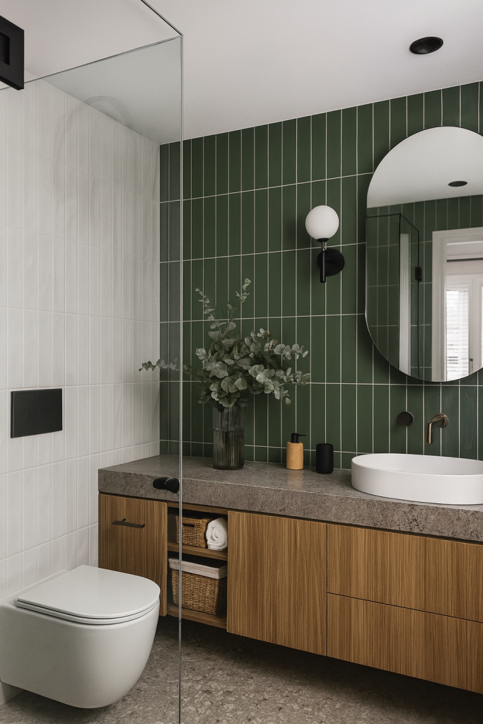 Bathrooms today are more than just functional — they’re spaces for comfort and relaxation. Green tiles are a timeless choice, but the way they’re styled can create very different moods.